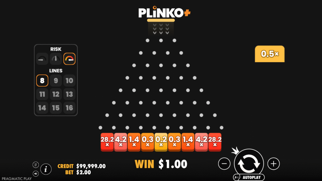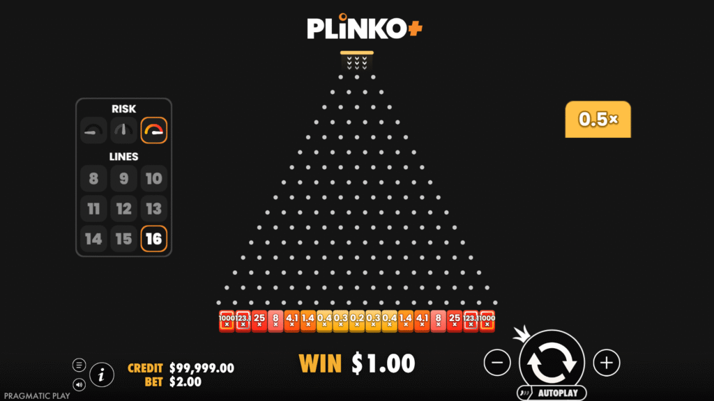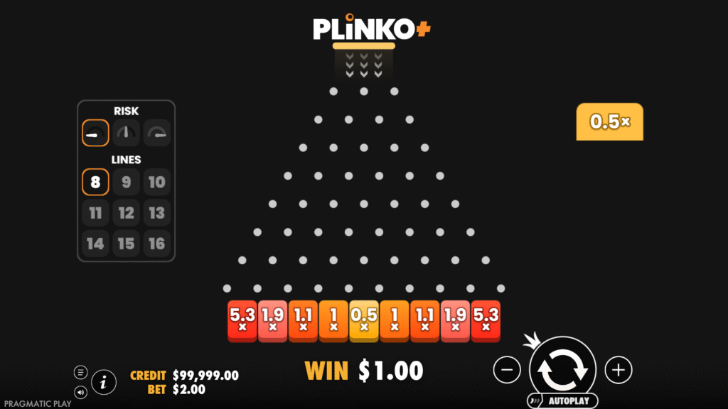 ကာစီနိုထဲက Arcade ဂိမ်းလို့ပြောလိုက်ရင် အများအားဖြင့် အားလုံးရင်းနှီးကြတာ Plinko ဂိမ်းတစ်မျိုးပါ။ ဒါပေမယ့် အခုတစ်ခါမှာတော့ Pragmatic Playက Arcade ဂိမ်းကို စိတ်တိုင်းကျ ဆော့ကစားလို့ရအောင် ပြင်ဆင်ပေးထားပါတယ်။ Risk နဲ့ Line အလိုက် ခွဲထားပြီး 8 Lines မှ 16 Lines အထိ စိတ်ကြိုက်ထားလို့ရပါတယ်။